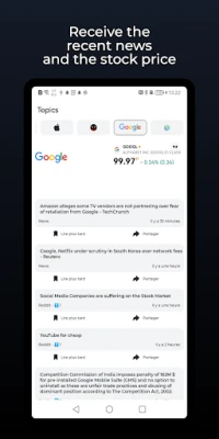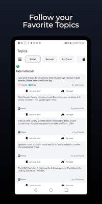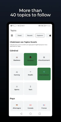 Topics offers you: - A Feed tab that gives you a summary of your favorite Topics - A Recent tab to see the news in real time - Over 40 topics to follow - Access the news and stock market of the different Topics